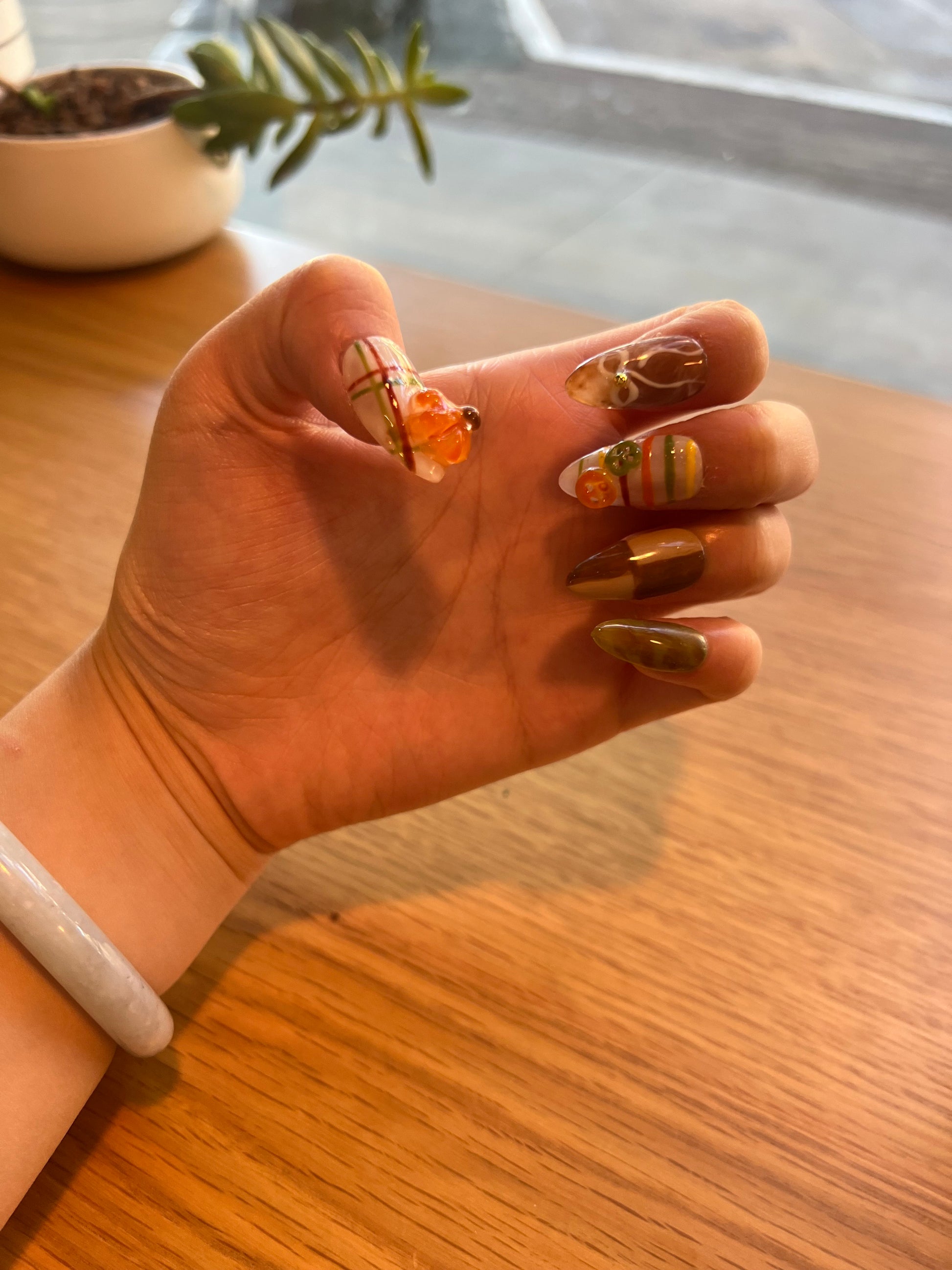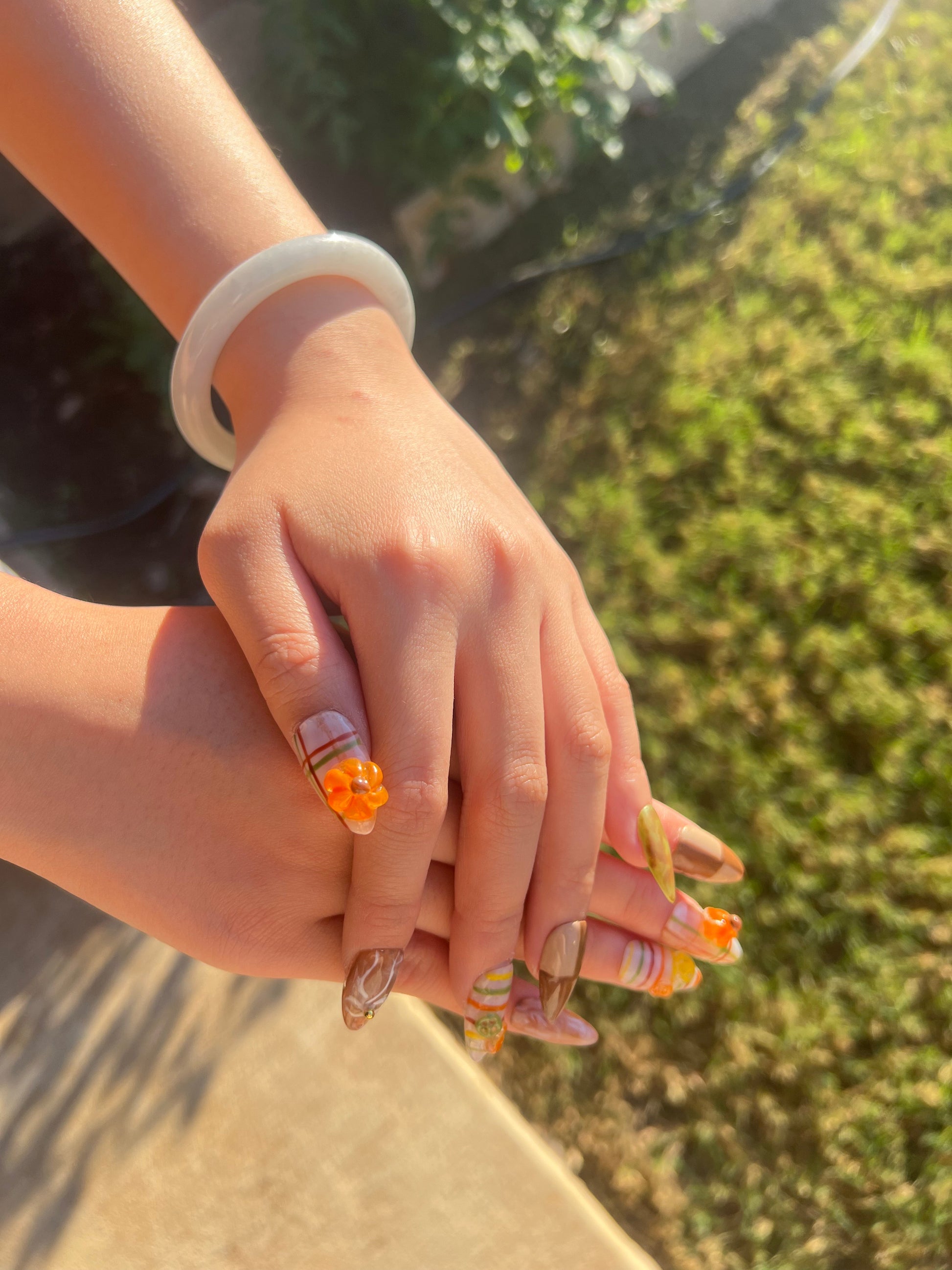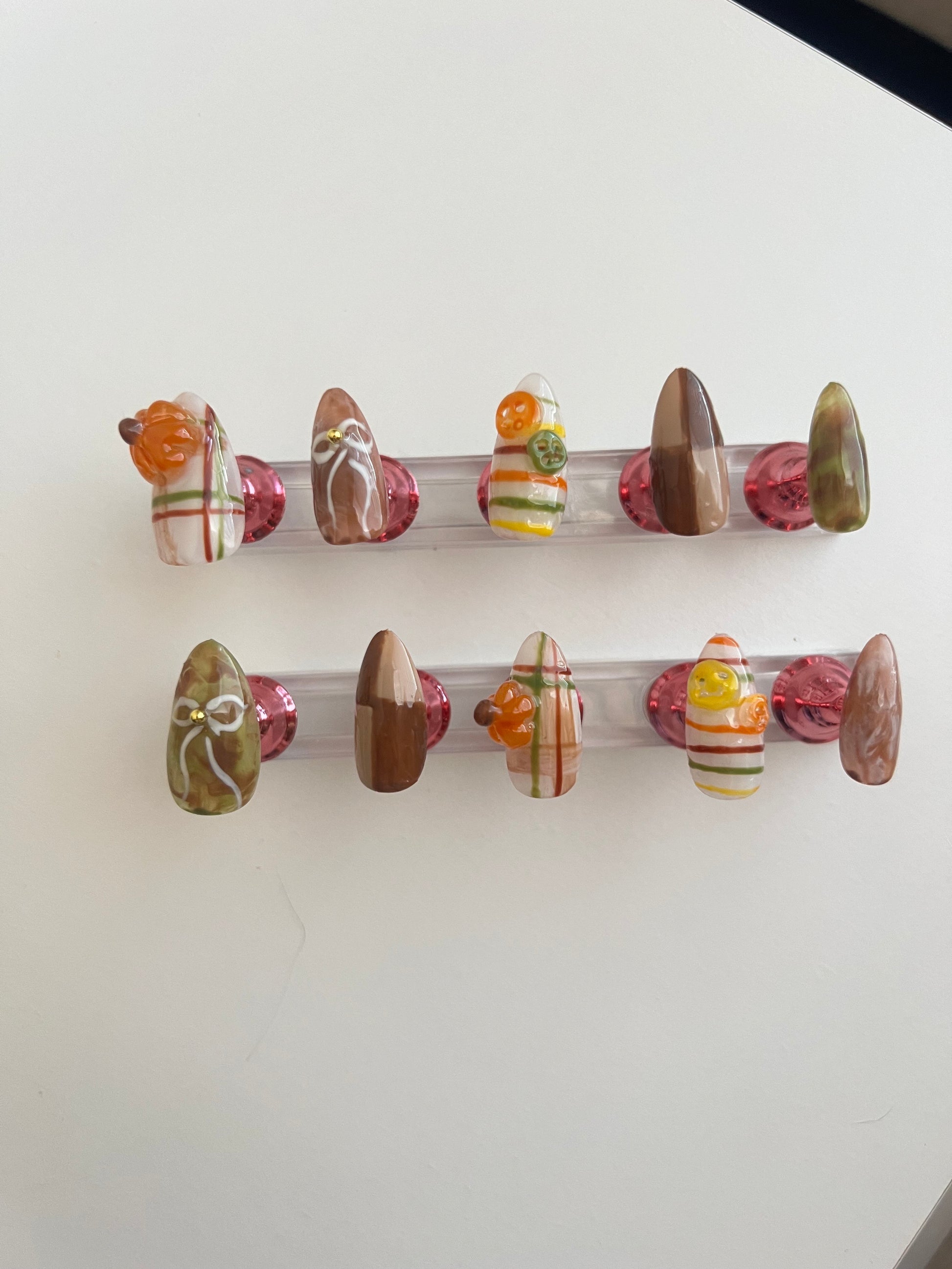 A cozy autumn-inspired set featuring warm browns, oranges, and greens with playful pumpkin accents. The mix of plaid patterns, glossy finishes, and 3D pumpkin charms captures the essence of a crisp fall day spent at the pumpkin patch — festive, earthy, and full of seasonal charm.